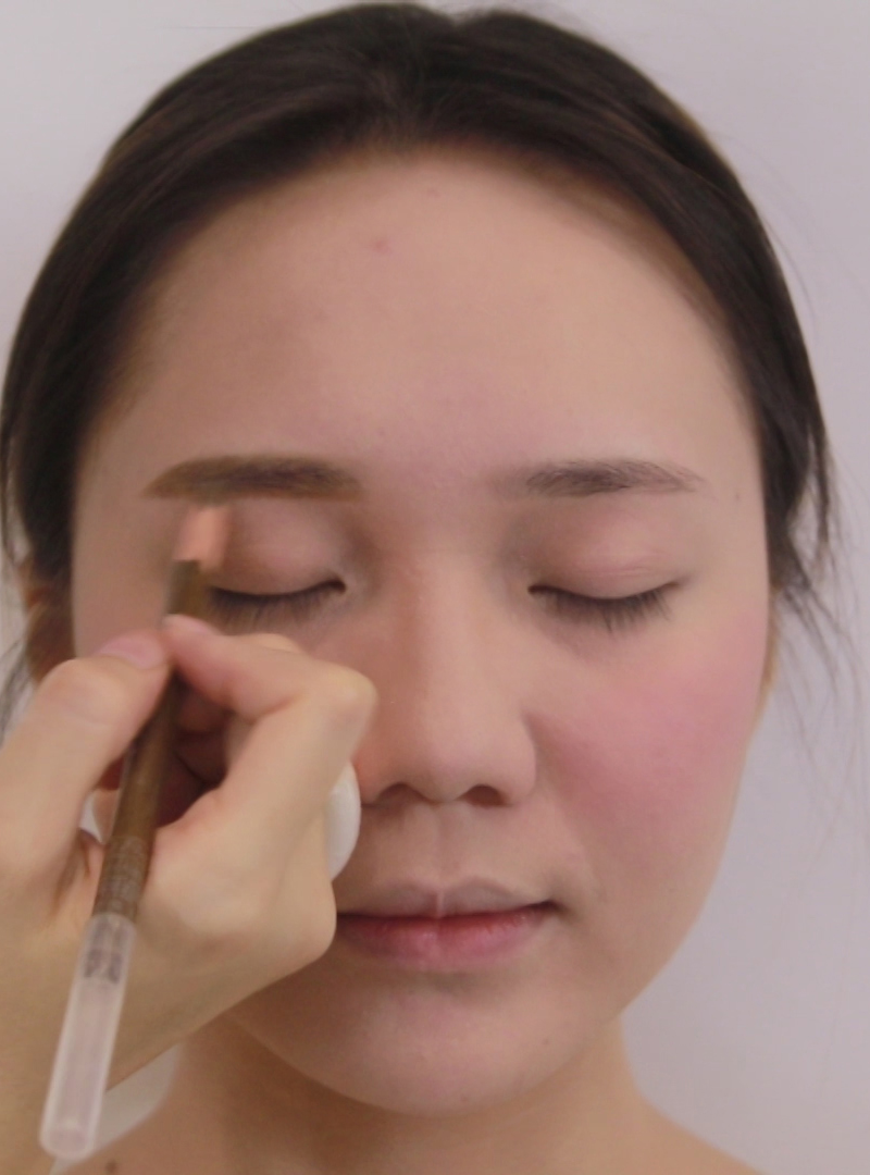 Apply matte cool taupe color on the middle of eyelid towards crease areas